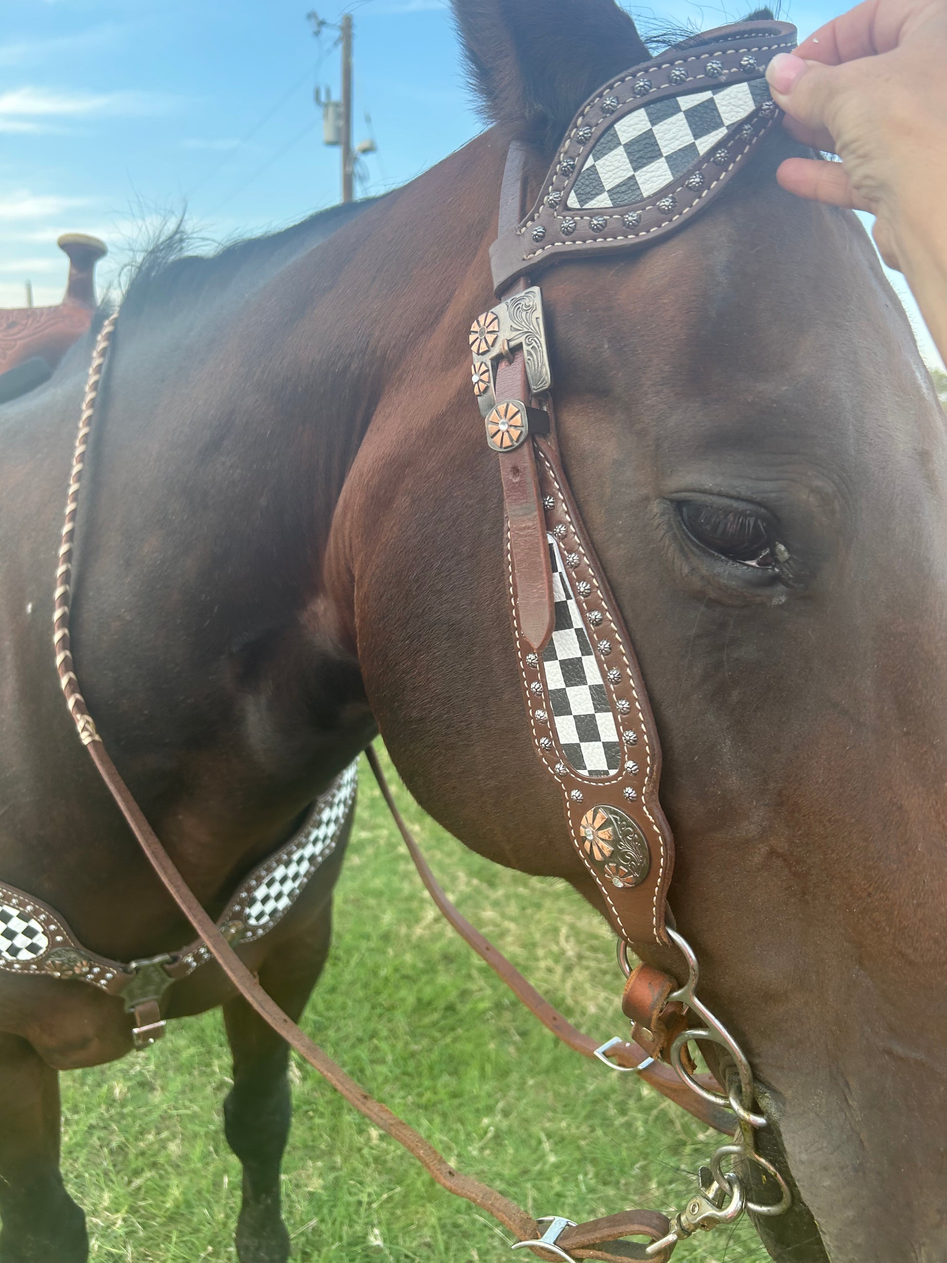 This one's built for speed - Finish Line is where horsepower meets girl power. The checkered inlay screams attitude and ambition, made for the cowgirl who rides hard, wins loud, and never looks back.
