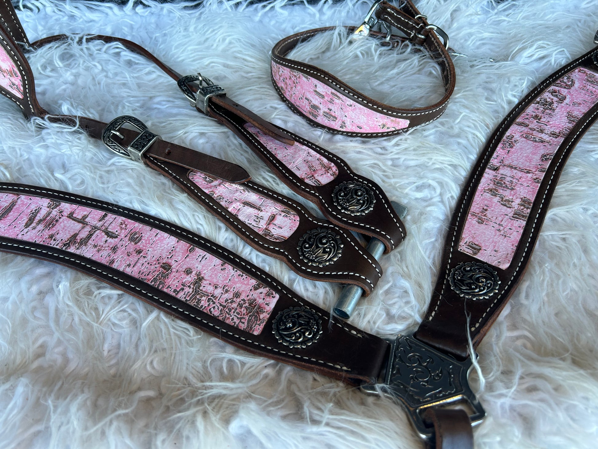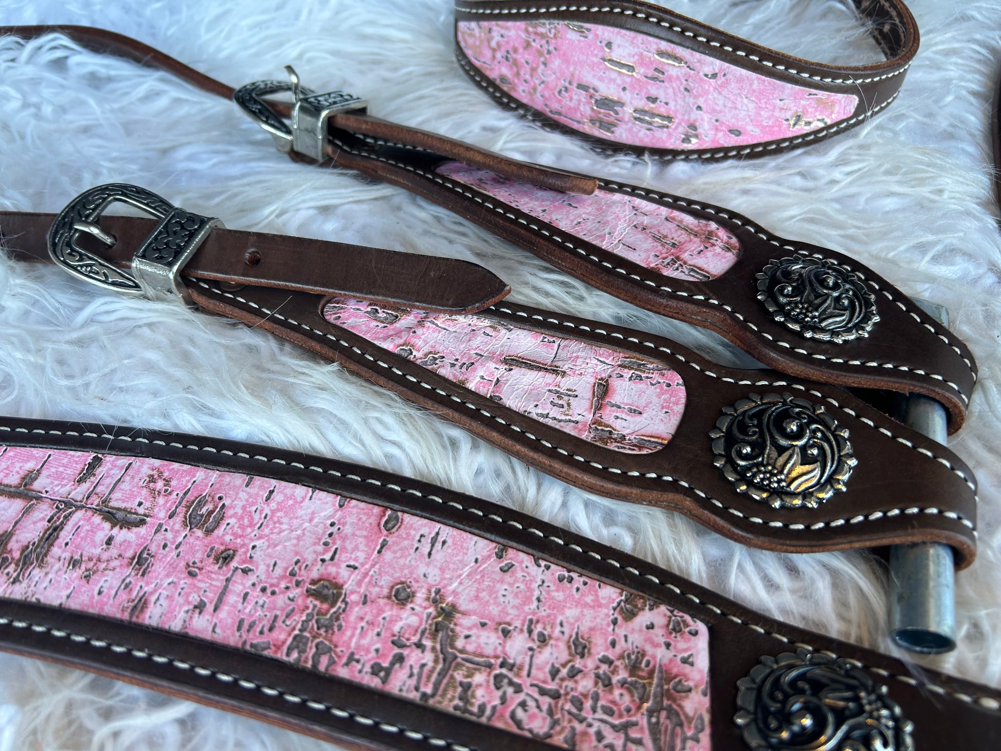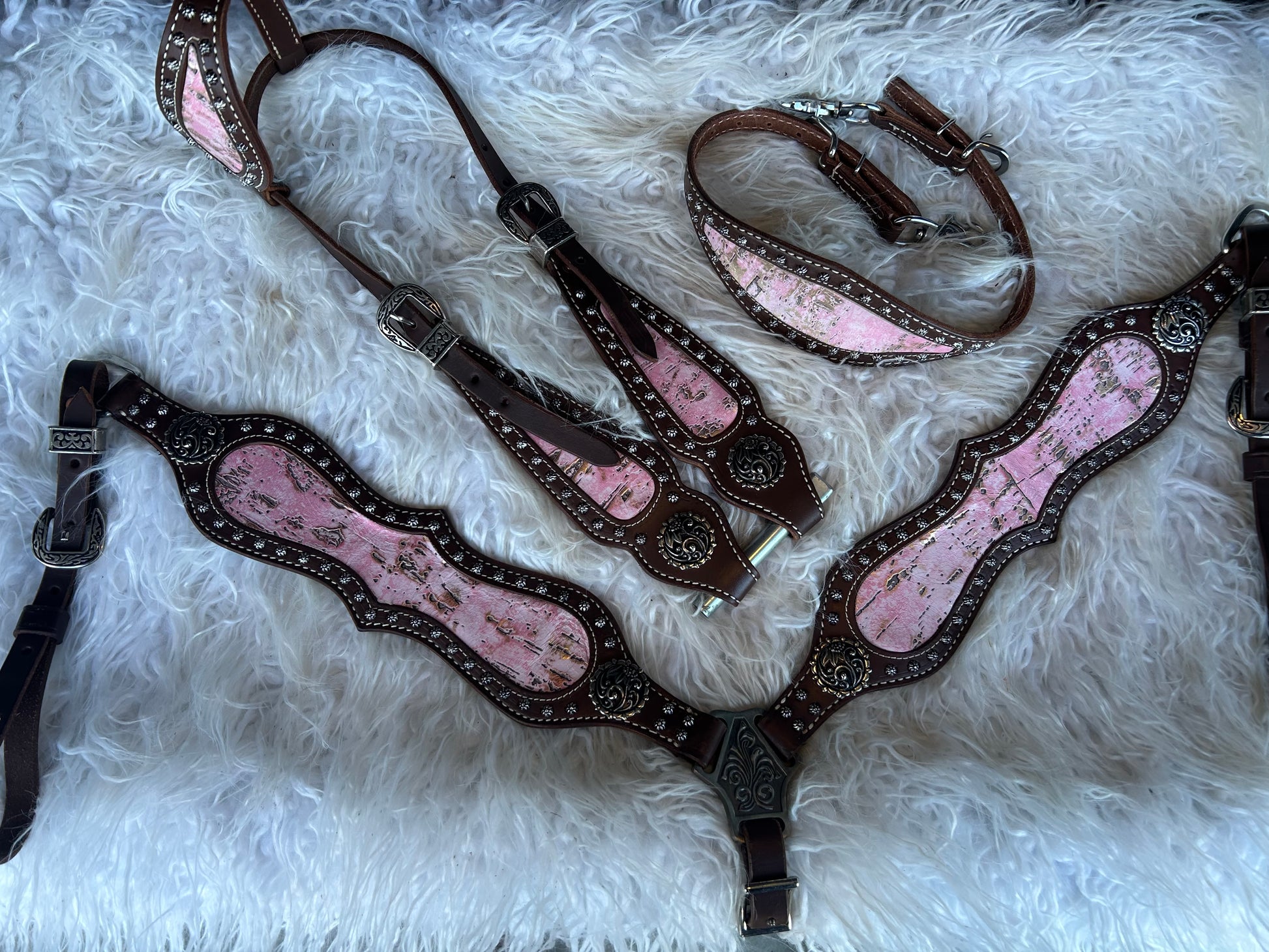 Meet Gilded Blush, the inlay that proves pretty can still be powerful. This design blends a dusty blush pink base with streaks of distressed metallic gold, giving your tack a look that’s equal parts sweetheart and showstopper.