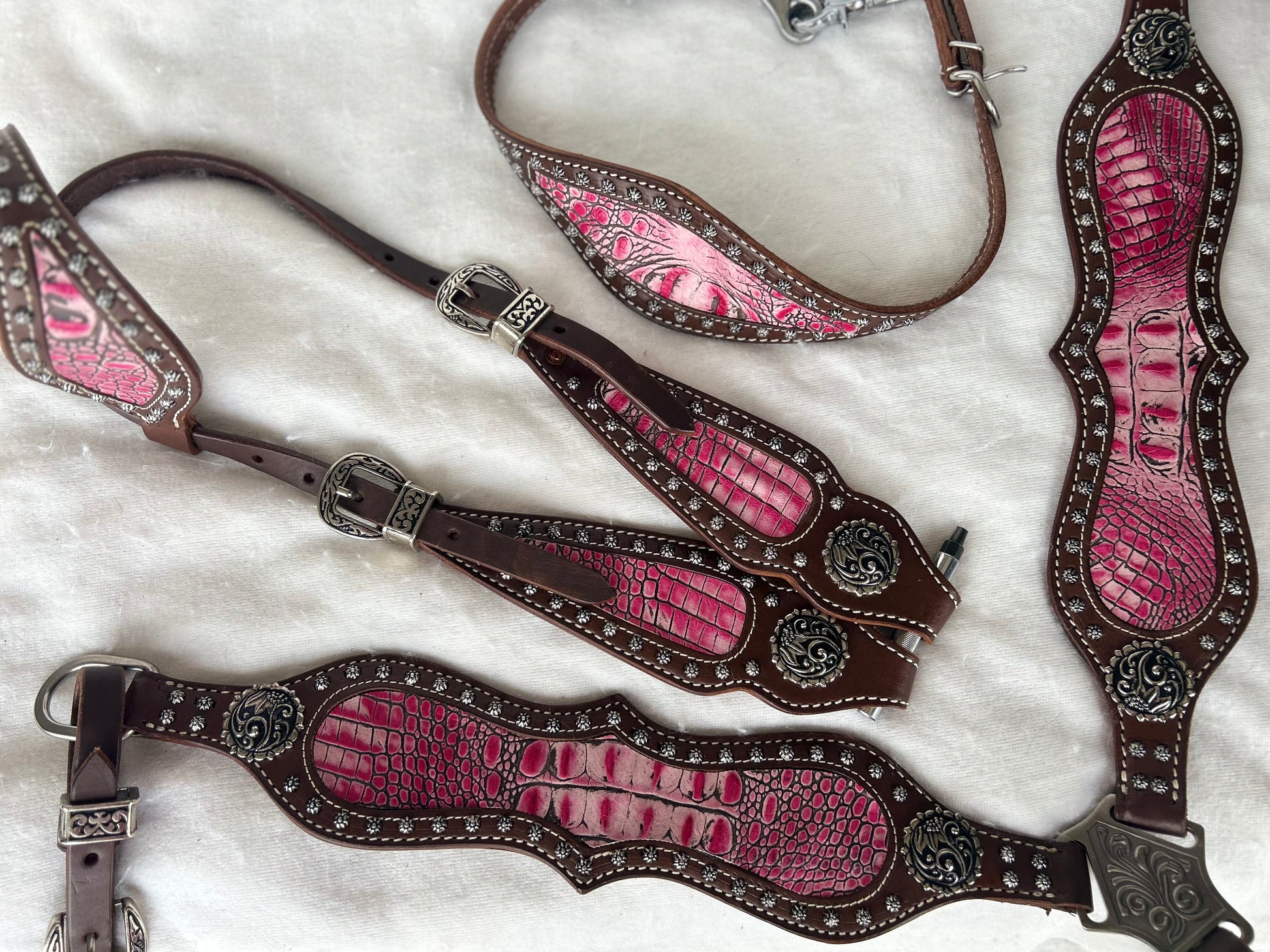 Turn heads and break the rules with the Hot Pink Gator inlay - fierce, fearless, and full of attitude, it's vibrant color pops with rockstar energy, giving your tack the perfect mix of wild and unstoppable. Made for the cowgirl who rides loud, proud, and unapologetically herself.